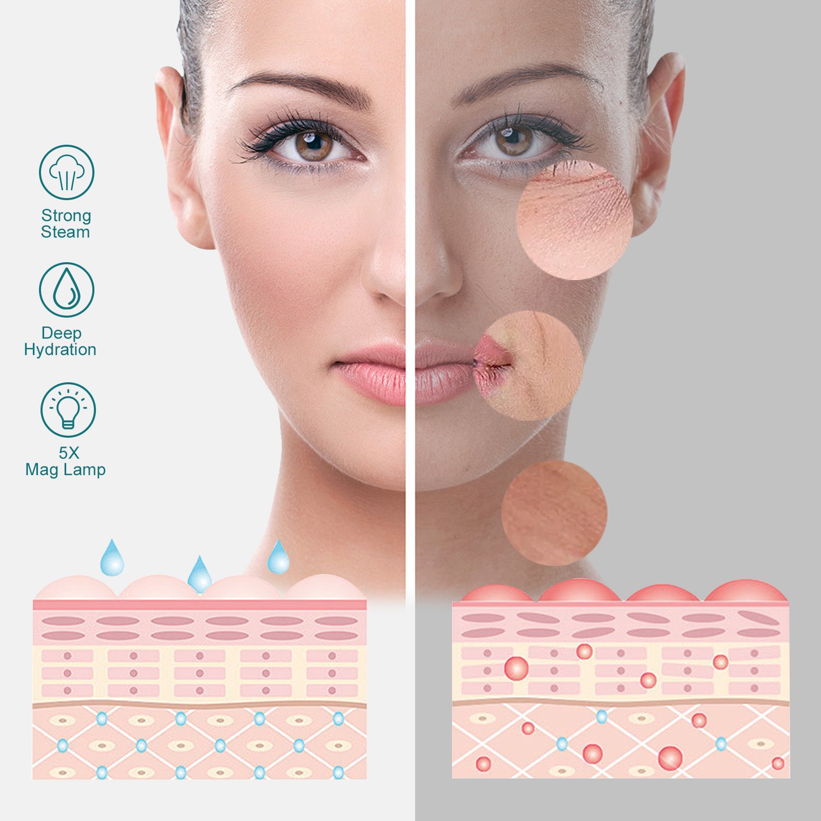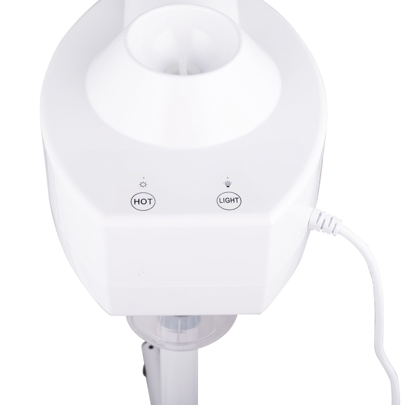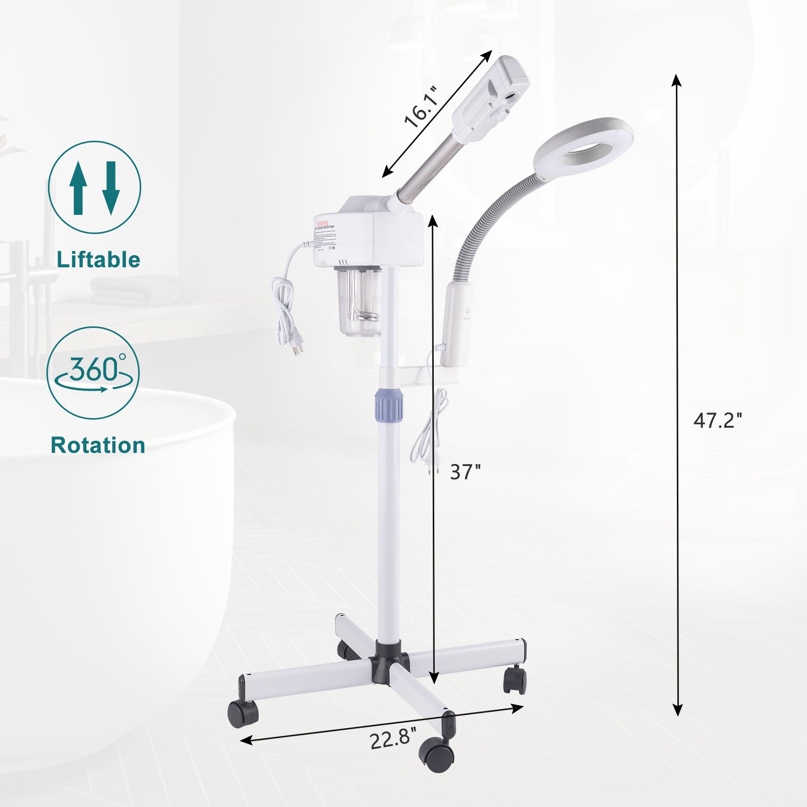 HYDRATES SKIN: It produce ionic ozone that mixed with steam, it can improve your texture of skin. The steamer for facial is suitable for a variety of skin, help to deal with skin problems.ADJUSTABLE AND FLEXIBLE: The beauty tools facial steamer's casters won't get caught in the hairs and move quick smoothly, you can flexibly adjust the height of the beauty steamer machine and the angle of the beauty lamp when needed.MAGNIFYING LAMP: The facial steamer with agnifying lamp, high quality bright magnifying glass help you see details clearly and you will know the true state of your skin.PROFESSIONAL CHOICE: The beauty tools facial steamer is suitable for most types of skin (like dry, oily skin), ideal for salon spas and beauty clinic. It also suitable for gifts to others because of beautiful appearance and practical functions.Assembly : This professional face steamer was easy to put together. and it has an opening in front of where the steam comes out where