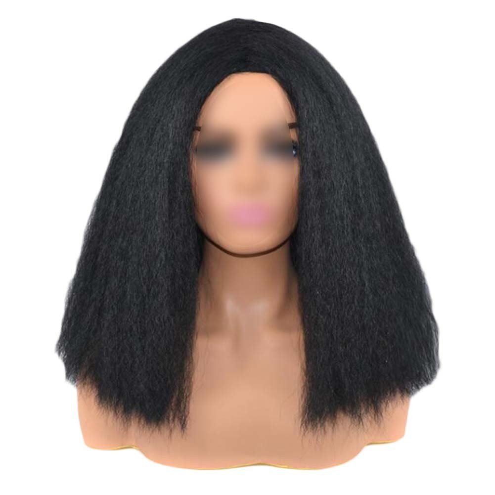 Black Afro Straight Bob Wigs Fluffy Synthetic Hair Yaki Straight Curly Medium Part Bang Full Wigs, 14Inch