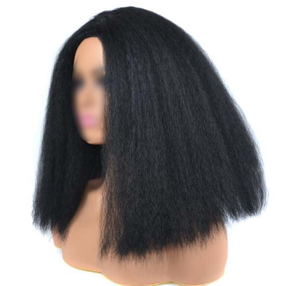 Home > Black Afro Straight Bob Wigs Fluffy Synthetic Hair Yaki Straight Curly Medium Part Bang Full Wigs, 14Inch