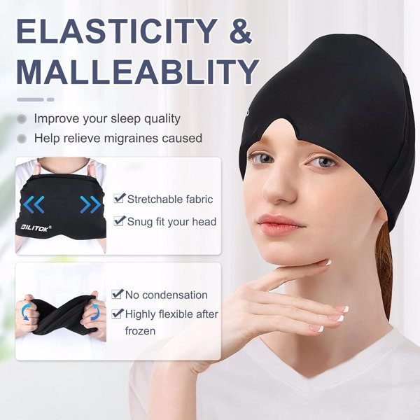 • [One-Piece Design] This headache relief hat provides 360 degrees of natural cooling for your head to enjoy all round cold coverage. It is designed in one piece to wrap around your head easily. This stretchable migraine relief hat has an opening at the top design that allows hair to pass through, allowing the cold and pressure to reach the scalp. It is ideal for the majority of people's head shapes.