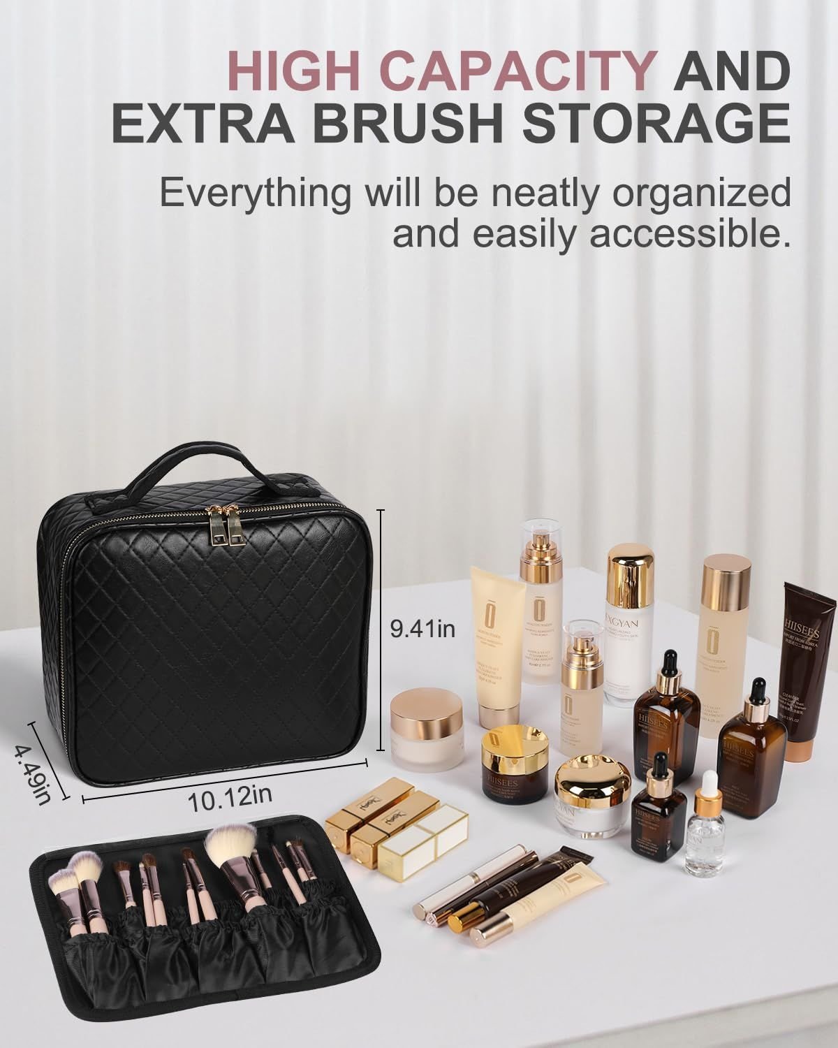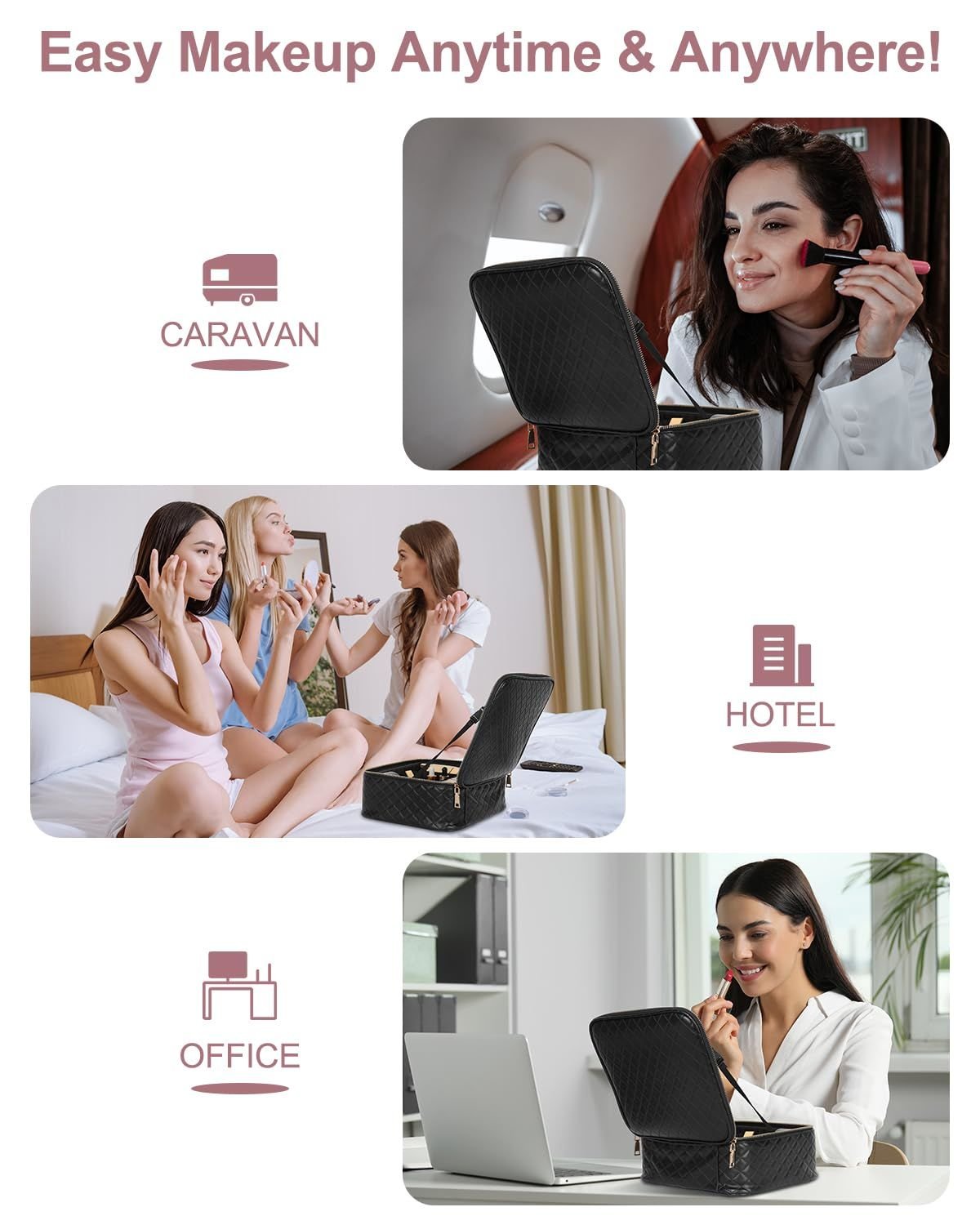 [Two-In-One Makeup Bag + LED Makeup Mirror]A large-capacity cosmetic bag with freely adjustable storage space, including a detachable stand-alone make-up mirror, and a makeup brush organiser panel.[1X2X3X Three-In-One Mirror] It can be magnified 2-3 times to perfect eye and lip makeup details. Three LED light modes (cool/warm/natural) are available to cope with different makeup needs.The LED makeup mirror comes with a stand on the back, which can be detached and used as a makeup mirror alone. 2000 mAh battery, can be used for about 10-12 days (30 minutes per day) on a single charge.[Large Capacity, Adjustable Partition Storage]Six EVA partitions can be adjusted according to the size of cosmetics, and can store various lotions, creams, eye shadow palettes, etc. It also comes with a makeup brush storage board that can store 10 makeup brushes. Partitioned storage and sponge pad protection to prevent cosmetics from being damaged by collisions.[Portable Travel Makeup Case]Makeup train case size is approximately 10.12*9.4*4.48in. Store your skin care products, makeup tools, toiletries, etc.that you need during your journey.You can easily put it in your suitcase or carry it with you by using the handle. Thickened protective pad to avoid damage to internal items during transportation.