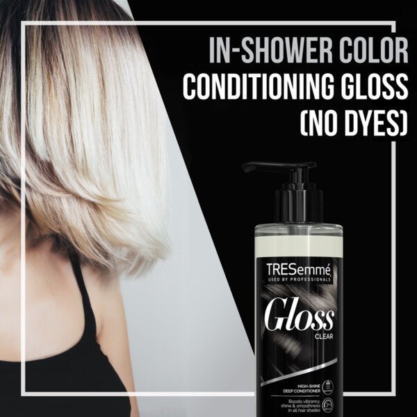 Extend color vibrancy and shine with the TRESemmé gloss collection. TRESemmé gloss clear is an in-shower gloss formulated to provide instant shine; smoothness; and color vibrancy. This dye-free; shine-enhancing deep conditioner will be your new go-to in between salon visits to get shinier hair in just 3 minutes. Expert tip: Use instead of regular conditioner when you want to enhance shine; and vibrancy smoothness. After shampooing; apply evenly throughout damp hair; leave for 3 minutes; and then rinse with water. From our origins in salons; we have always been driven by a simple truth: Every woman deserves to look fabulous; like they've just stepped out of the salon; without spending a fortune. TRESemmé is dedicated to creating hair care and styling products that are salon quality without the salon price. Great for all hair types; this color touch-up solution will extend the time between visits to the salon so that you can have a professional quality experience at home. The TRESemmé mission is to create a disruptive path forward so women can lead the way in life and style.